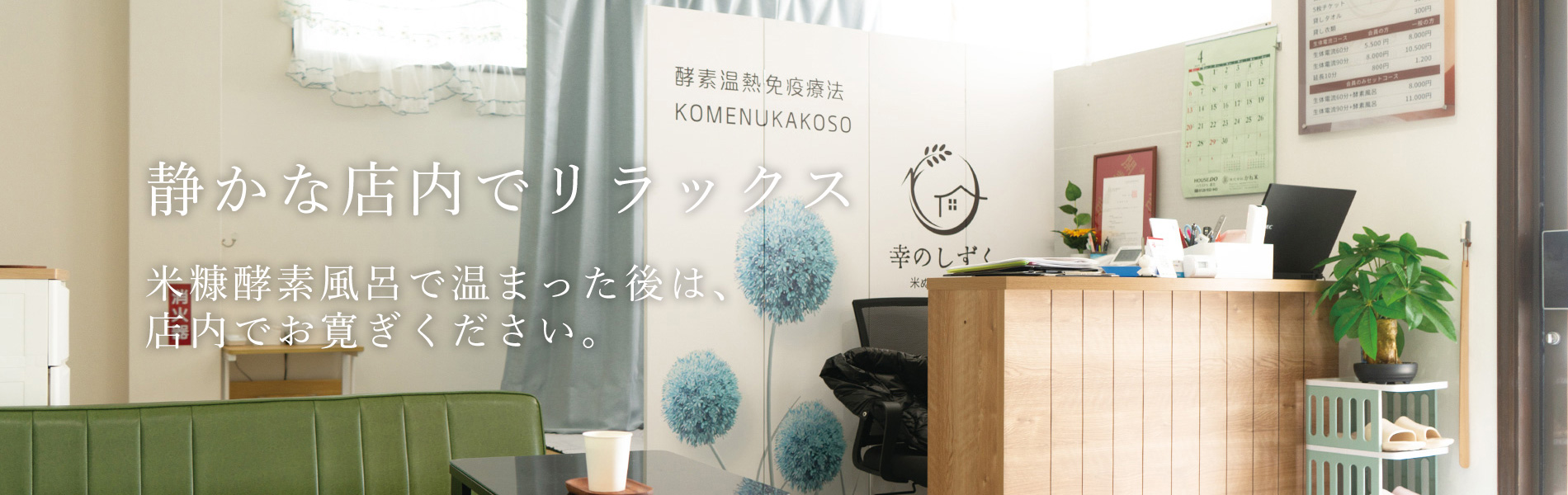 米ぬか酵素風呂「幸のしずく」は、お仕事帰りやお買い物ついでにも立ち寄りやすい便利な立地が魅力です。